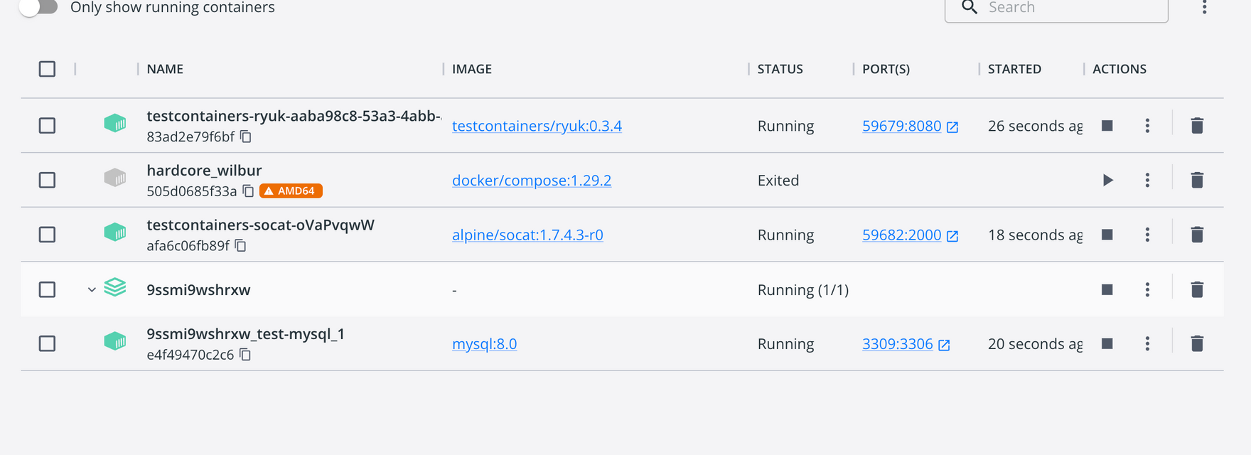 - MySQLContainer 를 사용할 때에는, 테스트 실행시 docker ps -a 를 쳤을 때, testcontainer, mysql 컨테이너 외의 추가적인 컨테이너가 존재하지 않는데, DockerComposeContainer 를 사용할 경우, 위의 캡쳐처럼 docker-compose 를 실행하기 위한 컨테이너가 초반에 실행되고 exit 되며, socat 컨테이너도 실행되고 있음을 볼 수 있다.