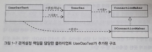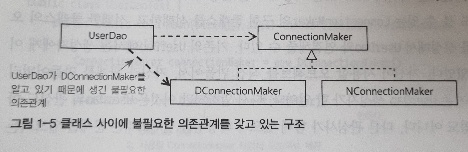 - Class 사이의 관계로는 : UserDao - ConnectionMaker(인터페이스) 사이의 관계.