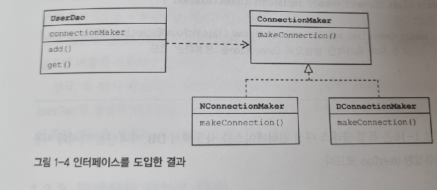 - 이러한 구현을 할 때는, 실수로라도, UserDao 측에서, 구체 클래스를 직접 생성하여, 직접적인 관계가 맺어지지 않도록 하는 것에 주의하자.